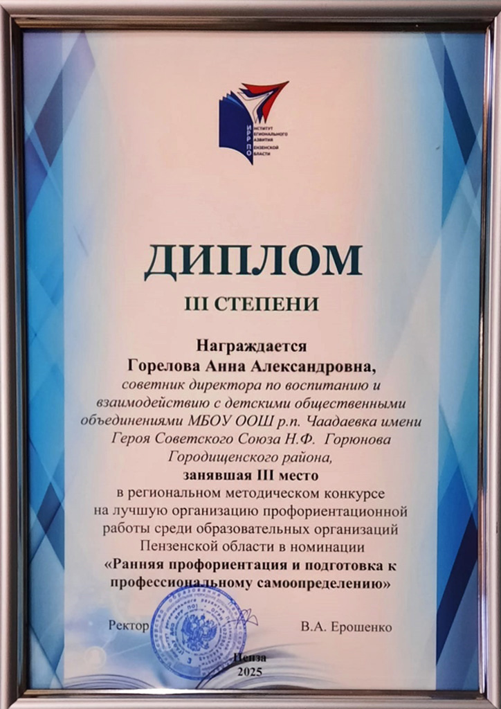 Советник директора по воспитанию и взаимодействию с детскими общественными объединениями Анна Горелова заняла почетное третье место в номинации "Ранняя профориентация и подготовка к профессиональному самоопределению".